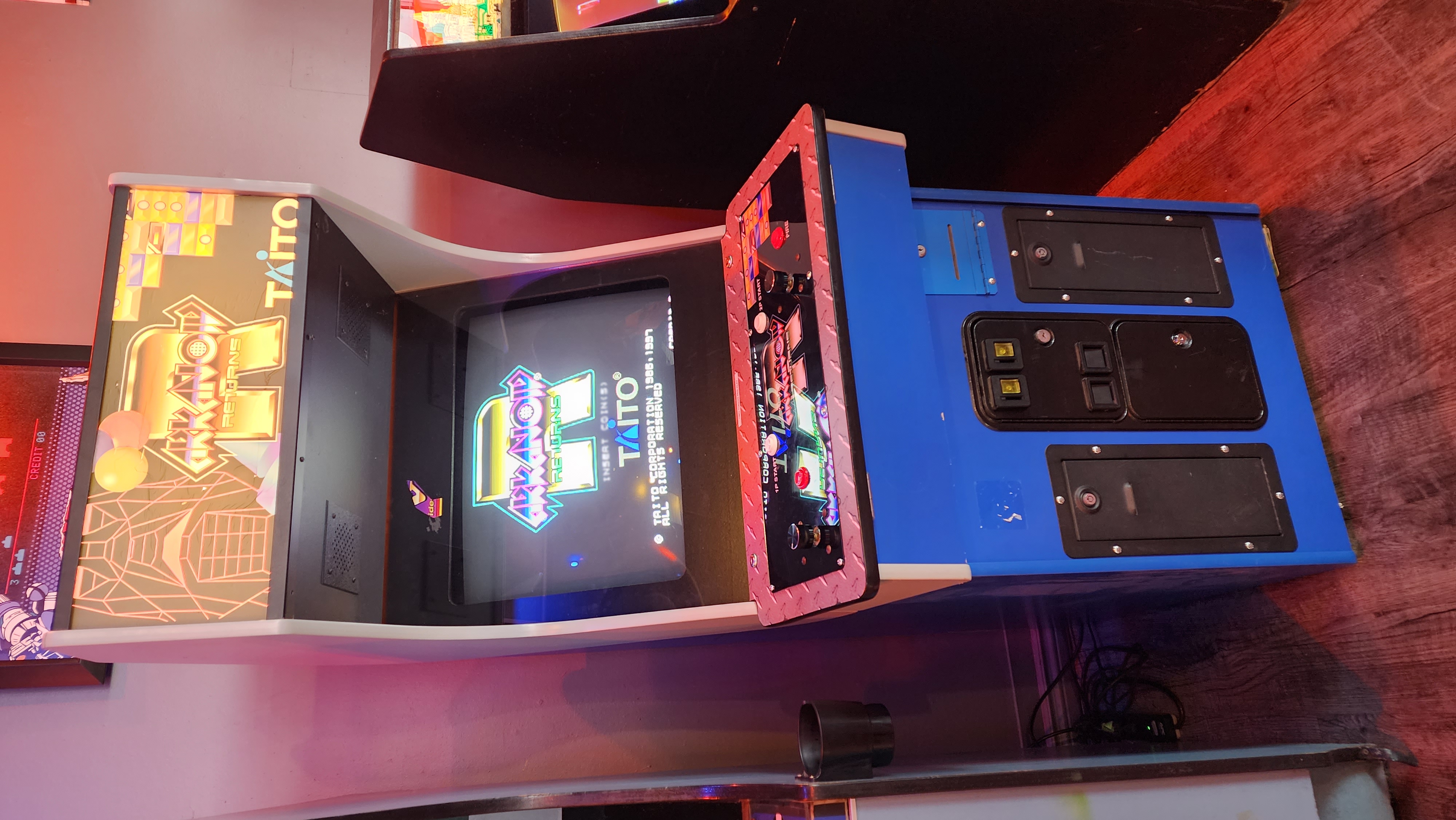 Arkanoid Returns from 1997 is a sequel to the classic Arkanoid from 1986. The big improvement in this game is the two-player simultaneous mode! Arkanoid Returns runs on the Taito F3 hardware. The arcade cabinet itself is converted from a Lazer-Tron Video Redemption System cabinet, as evidenced by the leftover ticket dispensers on the front of the machine! These are well built cabinets from the early 2000s with large control panels and a Wells Gardner D9200 tri-sync monitor.